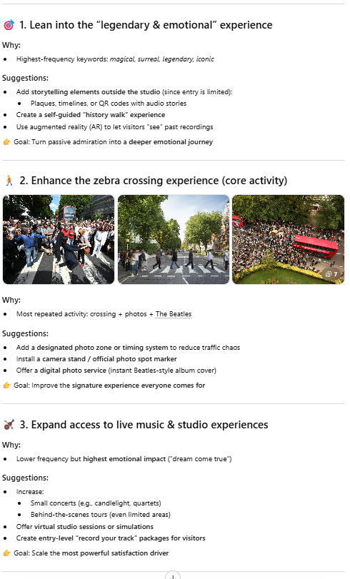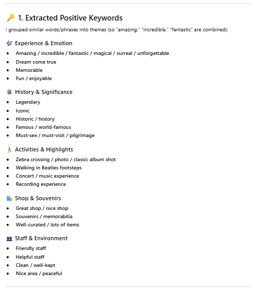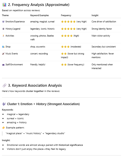 I copied and pasted this prompt into Chat GPT: “Extract positive keywords from those reviews, and analyze the frequency and associations of these keywords.” I also copied and pasted this prompt into Chat GPT: “What would be suggestions from the findings?”